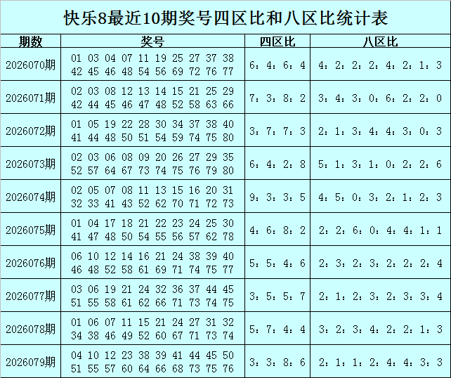 福彩快活8第2026079期开奖转头:04 10 12 23 38 39 41 44 45 50 51 55 57 60 64 66 68 73 75 76,其中奖号八区比为2:1:1:2:4:4:3:3。