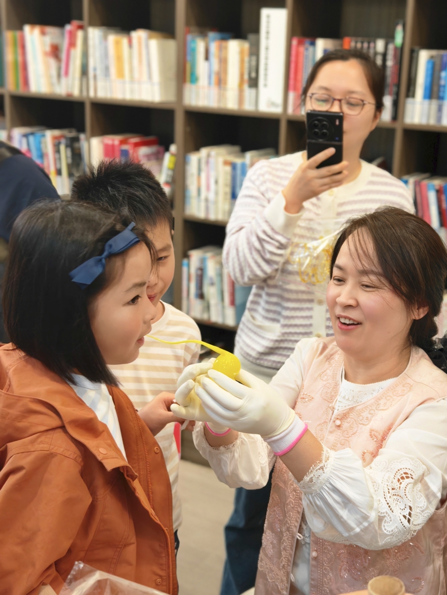 樱花烂漫之际,宝山区藏书楼4月6日还将“樱花树下的故事荟”送进顾村公园内“樱悦书苑”分享书斋,解锁流传千年的民间传统时间糖东谈主、糖画。熬糖、拉丝、造型,大手牵小手在玩乐中了解民俗文化,合作创造甜密作品,留下春日暖心回忆。“这果然一次又甜又欣忭的体验!”12岁的姚秋帆雀跃地吹了糖东谈主,作念了糖画。