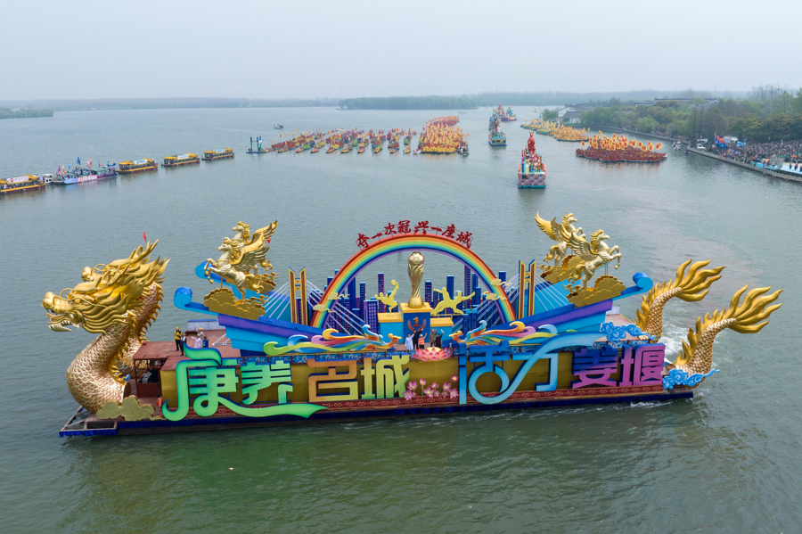 当先出场的领航船,船身“康养名城 活力姜堰”字样熠熠生辉,紧随后来的祭祀船彰显“天平地安 国富民强”的好意思好祝福,生肖船以“骐骥飞驰 福禄祥瑞”为意,融入马年元素,展现奋进姿态。随后出场的4条道喜船是本年一大亮点,主题离别是“勤来溱湖 养生育福”“梦回溱湖湾 爱在鹊仙岛”“奋楫争先 立篙潮头”“来姜堰 赢将来”。