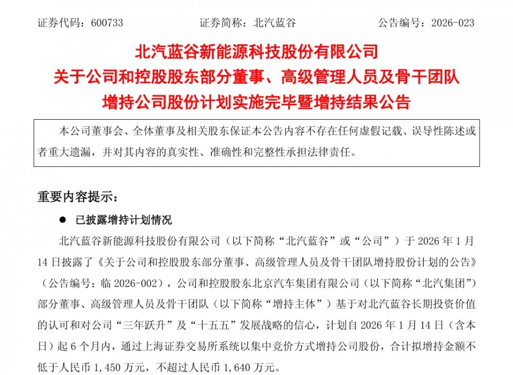北汽蓝谷(600733.SH)近日泄漏中枢管束层集体增持蓄意试验已矣暨增持后果公告。公告泄漏,本次增持由北汽集团董事长张建勇、北汽集团总司理常瑞、北汽蓝谷董事长张国富领衔,包括集团及上市公司两级中枢管束层共计22东说念主参与,以自有资金总共增持1532.78万元,占公司总股本的0.0293%,增持平均成本约8.23元/股,这亦然近几年国企上市公司增持金额最大、东说念主数最多的高管增持行动。
