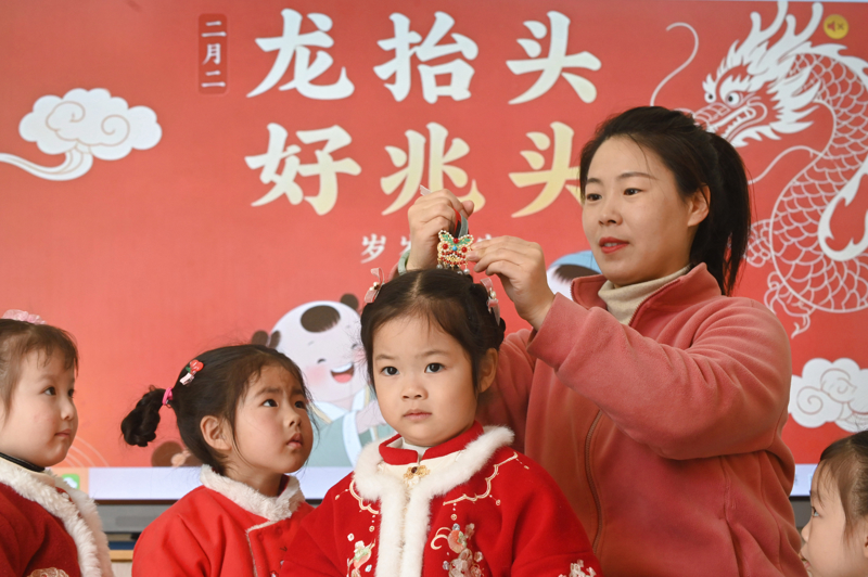 在河南省沁阳市第一幼教集团白庄村幼儿园,淳厚为小一又友“梳龙头”“扎龙辫”。 3月20日是春分气节,亦然农历二月初二,各地开展丰富多彩的算作,欢庆“双喜临门”。新华社发(杨帆摄)