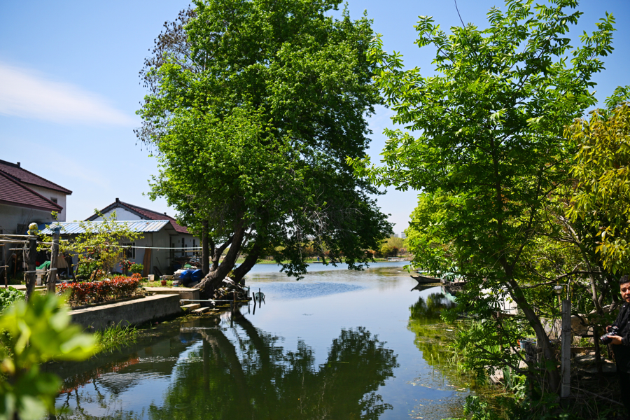 从村子北口往里走,穿过几排农舍,目下豁然开畅。一棵大香樟树静静伫立,树下是一派低洼的水塘。这片水塘就是山深村特等的遗产——溇沼。从航拍图上看,它像一弯眉月镶嵌田亩之间,外围是整皆的农田,内里是芦苇摇曳的水面,一条弯曲的水口劝诱着表里的水系。