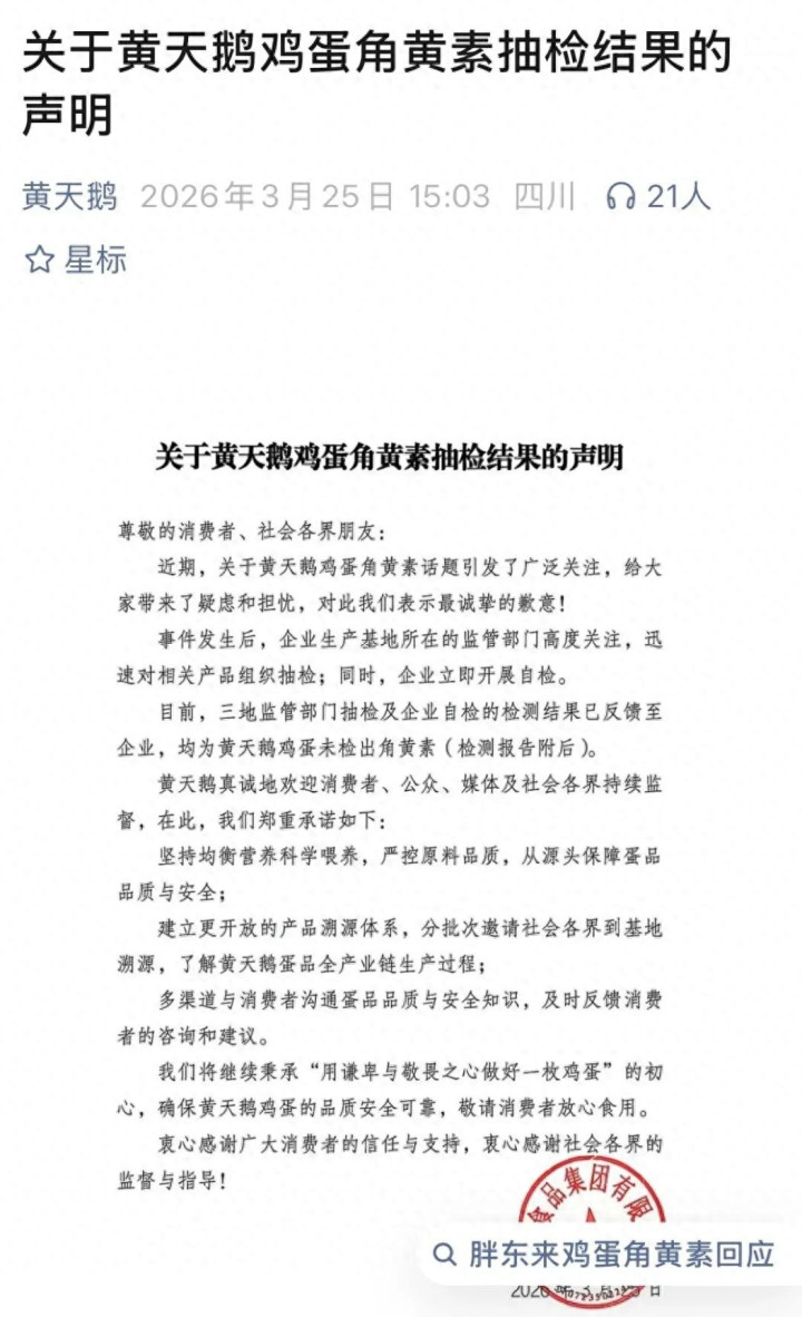3月25日,凤集食物集团有限公司(黄天鹅母公司)发布声明称,当今三地监管部门抽检及企业自检的检测恶果已响应至企业,均为黄天鹅鸡蛋未检出角黄素(斑蝥黄)。