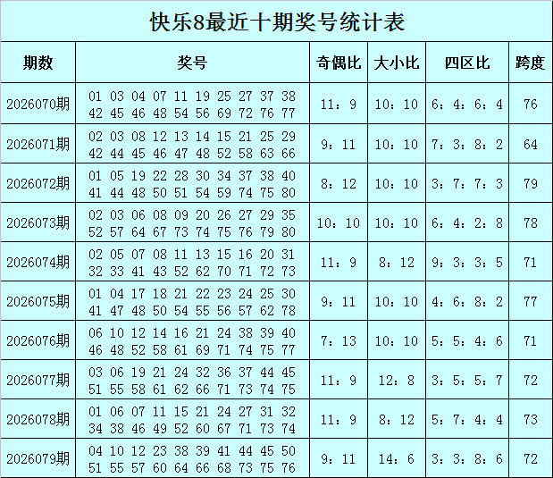 福彩鲁莽8第2026079期开奖回来:04 10 12 23 38 39 41 44 45 50 51 55 57 60 64 66 68 73 75 76,其中奖号奇偶比开出9:11,大小比开出14:6,四区比开出3:3:8:6,跨度开出72。