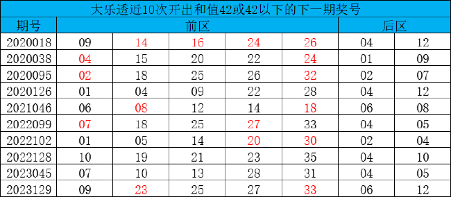 笔据笔者统计,前区和值42为本年开出的第一小和值,此前在2024005期开奖中,开出了03 05 07 09 12这一陌生组合,前区和值开出超小和值36,也创下了大乐透2024年历史中的最低和值,股市大盘行情位居历史第10位。笔者统计了近10次前区和值开出42或低于42以下的下一期奖号,给彩民选号提供一些灵感。