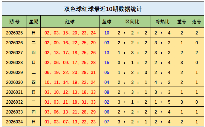 上期回归:双色球第2026034期开出奖号:红球01、03、07、13、22、23;蓝球07,其中红球三区比为3:2:1,开出2枚重号03、13,开出1组连号22、23,蓝球开出二区号码07。