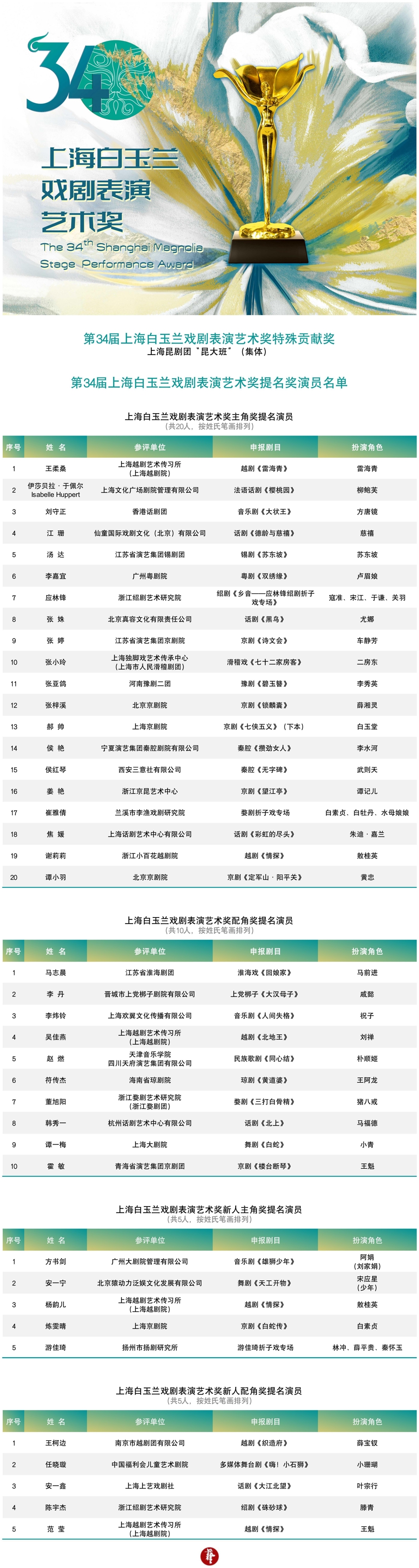 4月8日,第34届上海白玉兰戏剧扮演艺术奖提名奖出炉,40位优秀戏剧演员斩获提名奖,涵盖主角奖20东谈主、碎裂奖10东谈主、新东谈主主角奖5东谈主、新东谈主碎裂奖5东谈主。72岁法国有名演员伊莎贝拉·于佩尔以在沪上演《樱桃园》获主角奖提名,鼓励中外戏剧艺术疏通互鉴。4月24日晚,受奖晚会将在上海文化广场举行,现场揭晓各奖项。