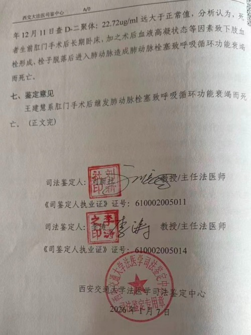 2026年4月10日,记者从石先生处取得一份由西安交通大学法医学司法刚烈中心出具的司法刚烈意见书,该机构分析觉得,王女士生前肛门手术后永恒卧床,加之术后血液高凝景色等要素致下肢血栓形成,栓子零散后干预肺动脉形成肺动脉栓塞致呼吸轮回功能贫瘠而升天。