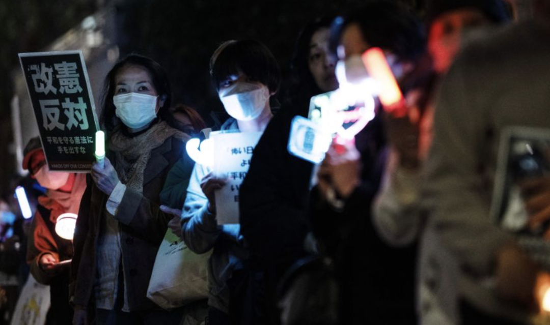在日本东京的首相官邸前,宇宙手握标语参加抗议活动。图源:新华社