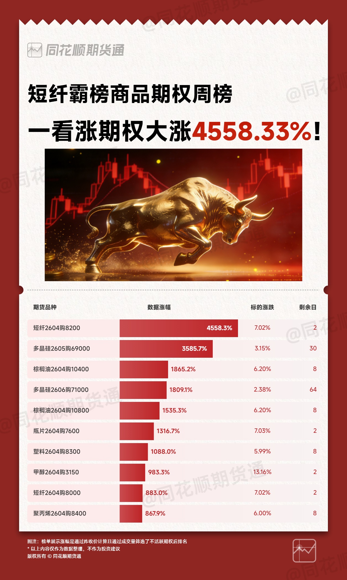 第 1 名:短纤2604购8200+4558.33%第 2 名:多晶硅2605购69000+3585.71%第 3 名:棕榈油2604购10400+1865.22%